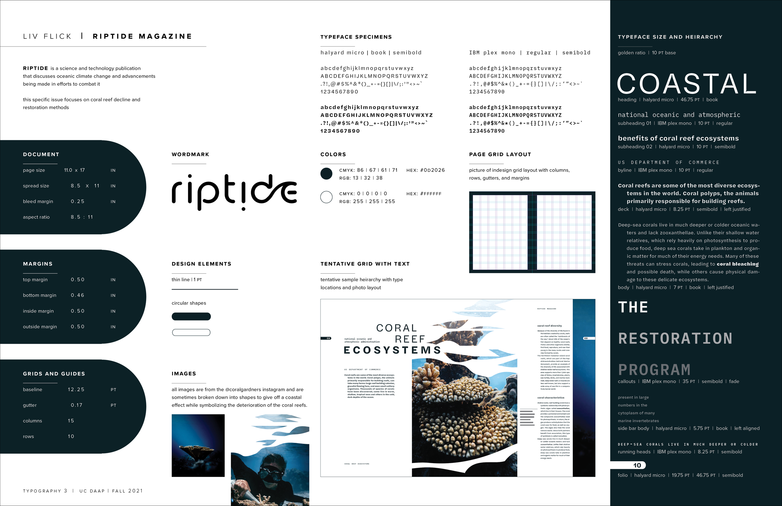 Riptide is a scientific publication that spreads awareness of oceanic climate change and the importance that we start acting now. Each issue is specific to a certain topic surrounding oceanic climate change. This issue focuses on coral reef deterioration and how scientists are working hard to restore the ecosystem.